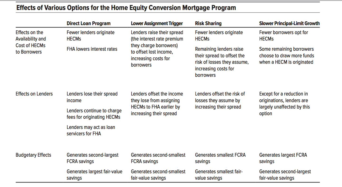 The Congressional Budget Office released a report Thursday exploring four proposed solutions for lessening the cost and risk of the reverse mortgage program to the federal government.