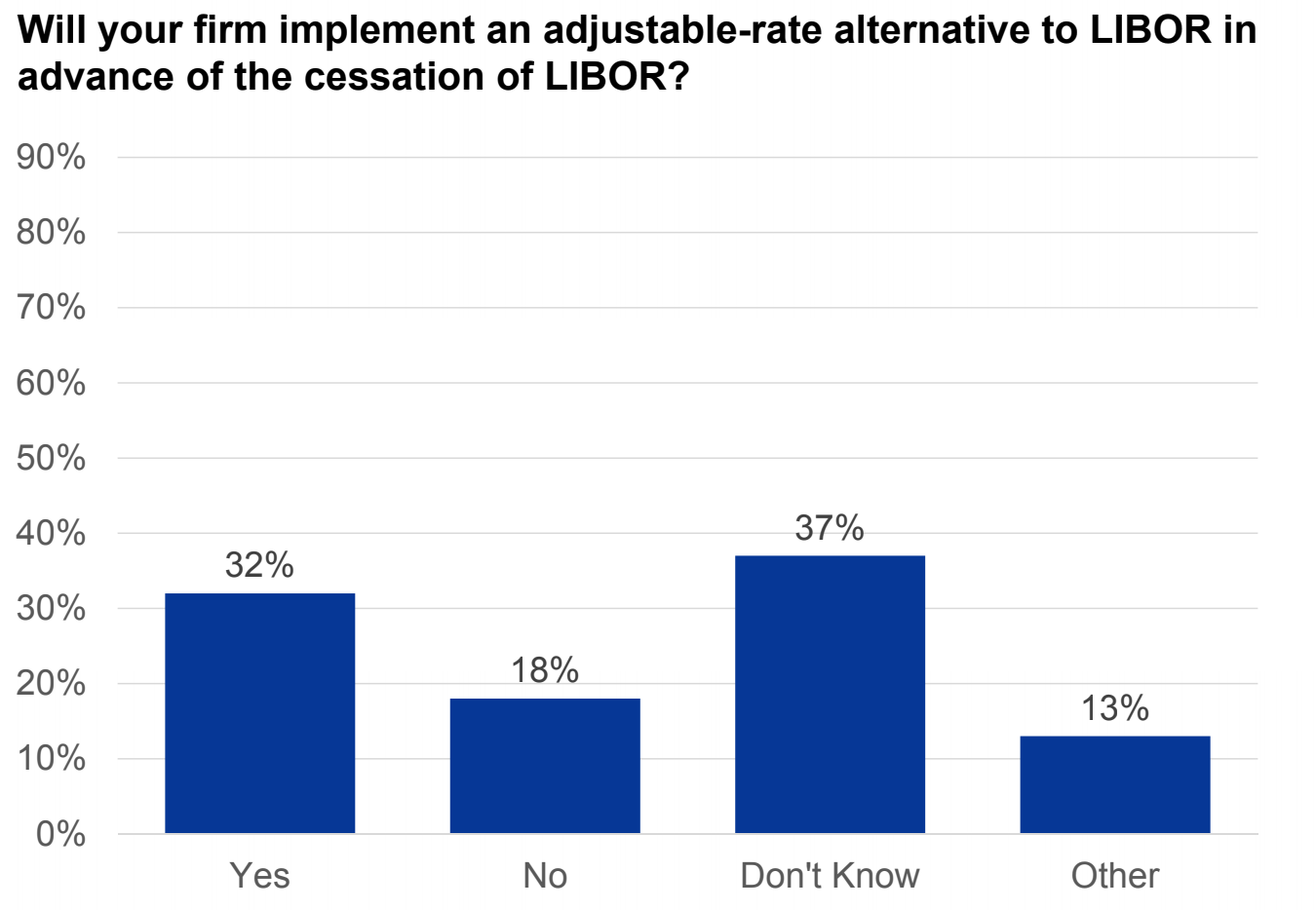But they are planning to start the transition from LIBOR sooner rather than later. The chart below shows 32% of applicants said they will implement an adjustable-rate alternative to LIBOR in advance of the cessation of LIBOR.