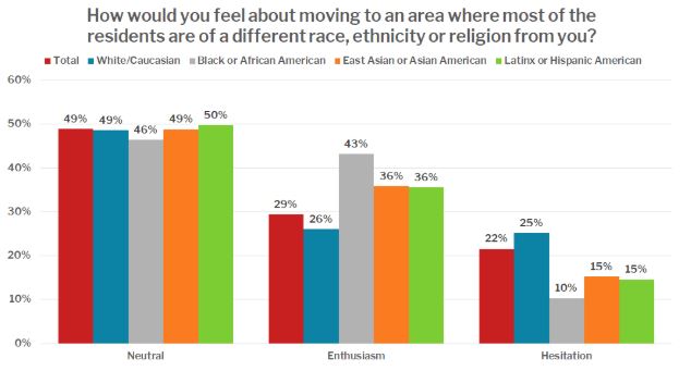 Of those 25 years old and younger, 41% said they were enthusiastic about moving to an area where most residents are a different race, ethnicity or religion than them. Only 16% of people ages 65 and older said they were enthusiastic about the same thing.