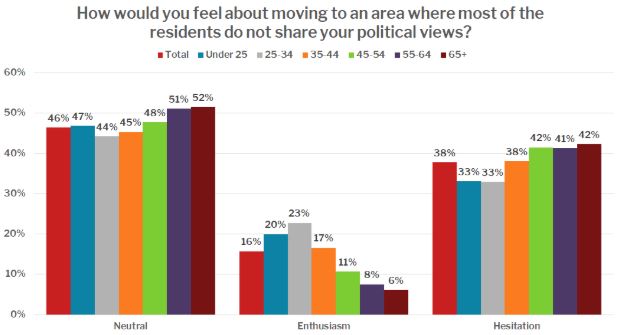 When comparing age, 23% of respondents ages 25 through 34 said they were enthusiastic about moving to an area where residents don’t share their political views, while only 6% of respondents ages 65 and older said they would be enthusiastic about it.