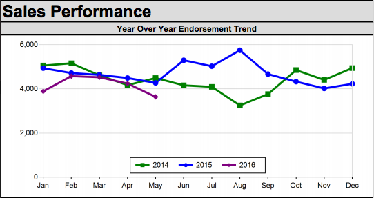 Although volume improved slightly in June, 2016 endorsements remain well-below both last year’s totals and those of 2014. As a result, just four of the top-1o states tracked by RMI reported volume growth year-to-date (YTD) through May 2016.