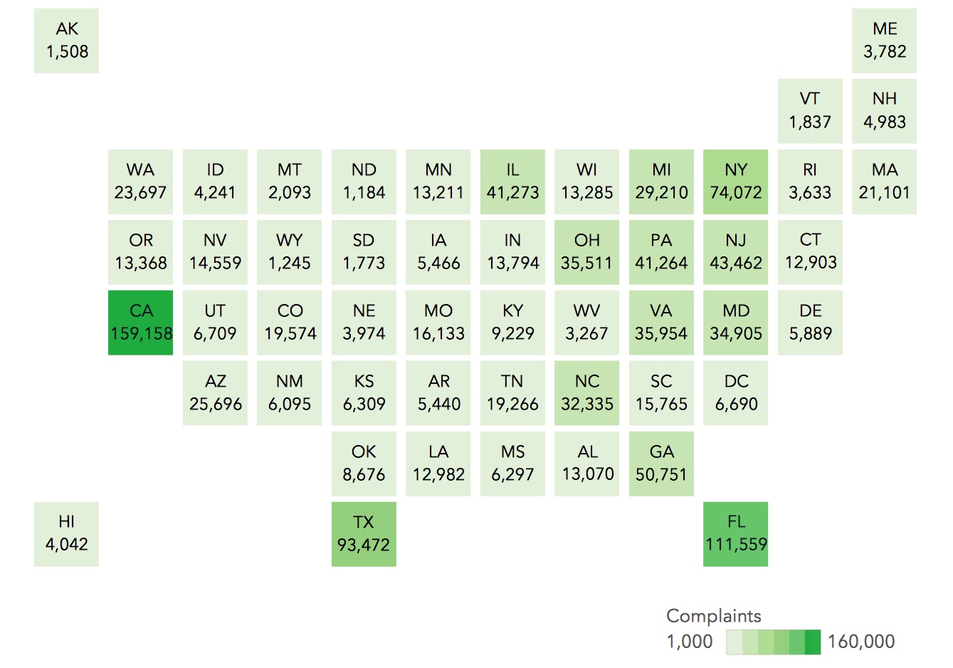 Since the CFPB began collecting complaints in 2011, California leads the nation with 14,933 submissions about financial products from respondents who self-identified as 62 or older, followed by Florida with 11,673 and New York with 6,098. On the other end of the spectrum, North Dakota — which ranked 49th by total population as of the last U.S. Census in 2010 — brought up the rear with just 59 submissions from older consumers.