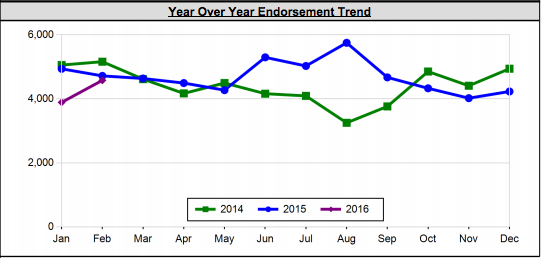 While most of the top-10 states for volume are trending lower endorsements year-to-date through February 2016, some have been seeing notable growth this year so far.