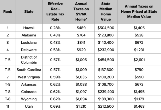 Sitting at the top of the ranks is Hawaii, which according to WalletHub has an effective real estate tax rate of 0.28%. At this rate, the annual taxes on a $176,000 home would be $489. The median home in the Aloha State, however, is far greater at $504,500. In that case, the annual taxes paid on a home of that worth would be $1,405.