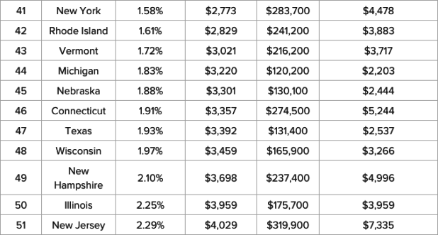 As for the bottom of the barrel, the three states with the highest property taxes are New Hampshire (49), Illinois (50) and New Jersey (51).
