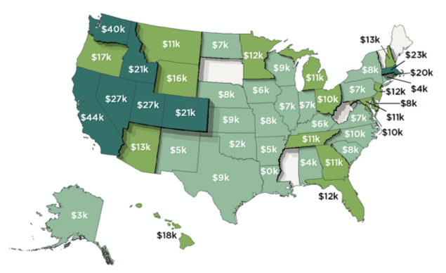 Still, appreciation along the Eastern seaboard lagged far behind the West: Massachusetts homeowners saw average gains of $23,000 in 2017, followed by Rhode Island at $20,000. No other Eastern state topped the $20,000 mark, while Nevada, Utah, Idaho, and Colorado all registered higher per-household gains.